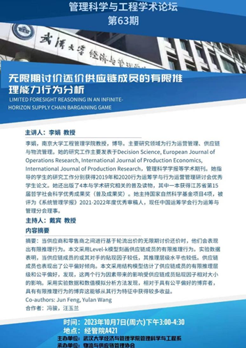 2023年10月7日下午,学院管理科学与工程系主办的管理科学与工程学术论坛第63期在A421成功举行,南京大学的李娟教授分享了行为运营管理方面的最新成果《无限期讨价还价供应链成员的有限推理能力行为分析》。本次论坛由戴宾教授主持,许明辉、冯华、陈植元、柯剑男、石越等老师和40多名研究生、本科生参加了本次活动。同时该活动也得到了av直播 物流与供应链管理协会的大力支持。
