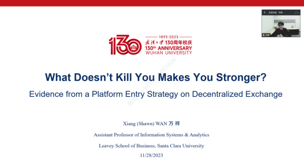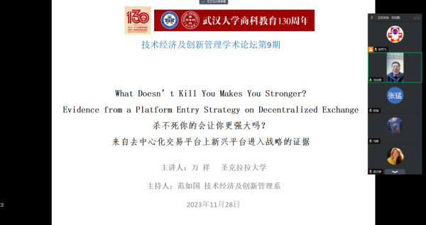 喜迎av直播 百卅庆典、av直播 商科教育130周年,av直播 技术经济及创新管理系于11月28日上午举办技术经济及创新管理学术论坛第9期,特邀美国圣克拉拉大学万祥老师举办学术讲座,讲座主题为“What Doesn’t Kill You Makes You Stronger? Evidence from a Platform Entry Strategy on Decentralized Exchange”。论坛由范如国教授主持。
