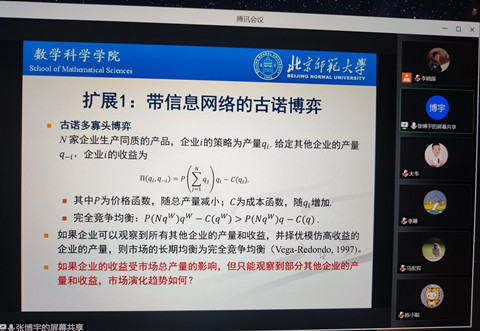 讲座聚焦于演化博弈,以“鹰鸽群体”中鹰鸽数量的稳定和社群中小偷数量的稳定两个例子生动阐释了Maynard Smith的主要观点,并深入浅出地引出了演化博弈论中重要的均衡概念,介绍了研究演化动态的连续时间复制动态方程(replicator dynamics),以及有限群体的学习与模仿动态对于复制动态方程的渐近模拟(近似)。随后,张博宇老师提到了数字经济时代人们的博弈互动关系呈现出复杂的网络特征,并指出运用网络博弈方法来分析和研究这种关系的重要意义。