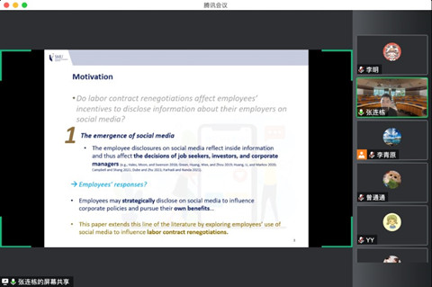 首先,张连栋教授介绍了文章的研究背景。近年来,学术界开始关注其他的信息渠道(例如,员工、卖空机构、媒体等其他利益相关者的信息披露)在资本市场的作用。其中,对于员工披露这一信息渠道的研究,多集中于员工向SEC举报财务造假等。随着社交媒体的应用越来越广泛,张教授及其他三位学者关注员工在Glassdoor上对公司的评级,进一步探究员工在社交媒体上披露雇主信息的动机及影响因素。