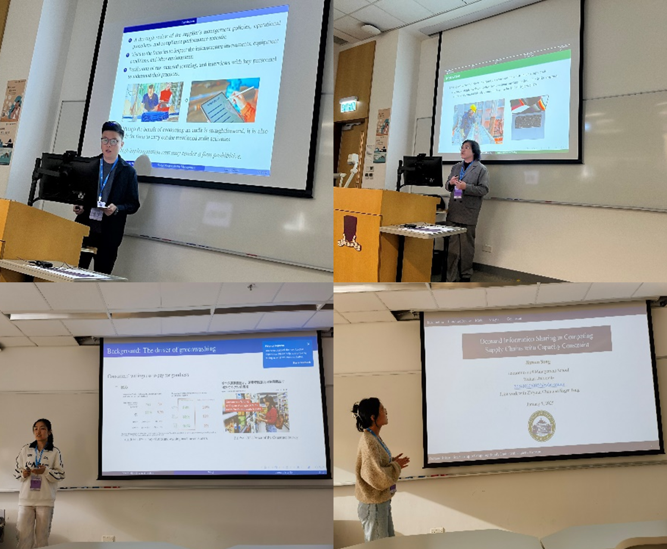 在学术交流环节,管理科学与工程系师生积极参与各项议程,与来自世界各地的专家学者展开深入探讨。其中,许明辉教授在会议中受邀担任“Sustainable supply chain operations”专题研讨的主席,组织专题讨论。袁睢秋同学分析了不对称信息下制造商的审计策略与机制设计问题,晏露玲同学分享了负责制造商何时能从“Greenwashing”行为中获益,郑义威和宋家雯同学则分别汇报了绿色供应链和产能限制下的需求信息共享等相关问题的研究进展。国际会议的学术交流让师生们紧跟学科前沿动态,拓展研究视野,激发创新灵感。