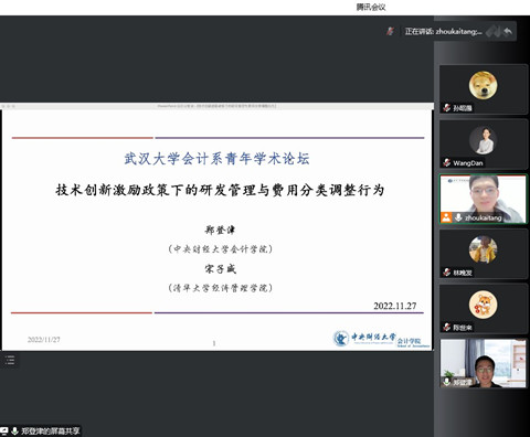 2022年11月27日下午,由av直播 主办,av直播 人文社会科学研究院、av直播 承办的蓝月亮珞珈会计论坛第101期通过线上方式举行。论坛邀请了中央财经大学会计学院郑登津老师做题为“技术创新激励政策下的研发管理与费用分类调整行为”的学术论文报告。论坛由学院会计系老师周楷唐主持,李青原总结。陈冬、林晚发、熊曦等多位老师和学生参加了此次论坛。