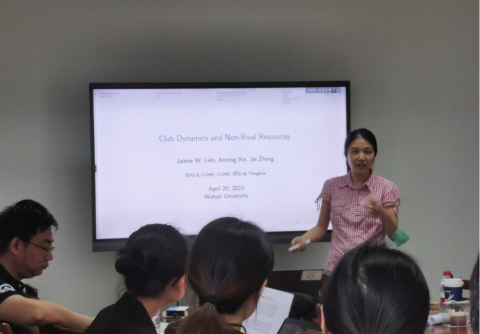 连暐虹教授报告了论文“Club Dynamics and Non-Rival Resources”。这篇文章考虑一个动态的俱乐部品博弈(dynamic club goods game)。在最灵活的会员决定程序下,会费是最高的,俱乐部的规模是最稳定的;将会员排除在俱乐部之外的能力会导致玩家之间最大的互惠行为,也被发现是贡献的关键决定因素。论文还发现最灵活会员制俱乐部商品博弈下的经验导致公共品博弈的贡献最高。