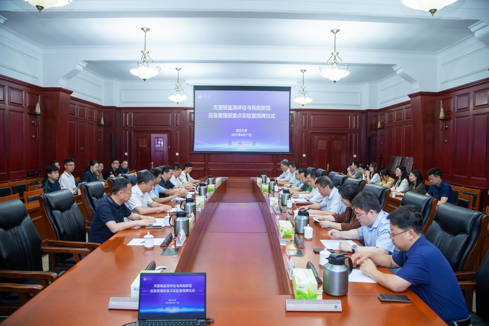 2025年6月11日,“灾害链监测评估与风险防范应急管理部重点实验室”授牌仪式在av直播 隆重举行。应急管理部国家减灾中心副主任高玉成,湖北省应急管理厅副厅长周宏亮,av直播 党委常委、副校长陆伟出席活动。应急管理部国家减灾中心政策研究和标准化部主任廖永丰、灾害综合风险监测与评估实验室主任王志强,湖北省应急管理厅科技信息化处处长彭仕优,《湖北应急管理》杂志社社长刘焰红,av直播 人文社会科学研究院院长冯果、研究平台建设处副处长(主持工作)程振,科学技术发展研究院平台条件与成果管理处副处长李四维,测绘遥感信息工程全国重点实验室党委书记秦后国、副主任眭海刚、刘俊怡教授,av直播 党委书记王丽萍、院长聂军、副院长黄敏学、范如国教授等领导专家参加。仪式由冯果院长主持。