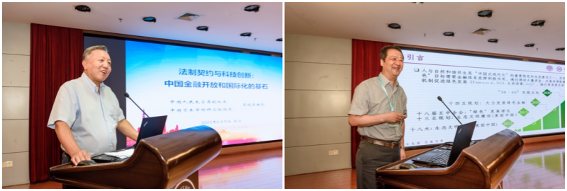 本届论坛的主旨演讲在av直播 A120举行,上下半场分别由金成武主任、av直播 金融系主任李斌主持。上半场,吴晓求教授首先作题为“法制契约于科技创新:中国金融开放和国际化的基石”的演讲。他将中国式现代化最核心的两大支点概括为经济的可持续增长和法制的现代化,认为经济的可持续增长需要依靠有中国特色的社会主义市场经济体制和模式,以及科技进步基础上的产业升级和迭代来保障与推动。随后,梁琪教授作题为“‘绿色溢价’谁获益?商业银行绿色治理的贷款溢价效应研究”的汇报,利用手工收集的中国上市公司贷款数据和我国银行绿色治理指数构建,考察了银行绿色治理对信贷定价的影响。研究发现,银行绿色治理会通过绿色声誉效应和绿色成本效应提高其信贷定价,且这一效应在银行端绿色治理类型和企业端绿色表现上存在异质性。
