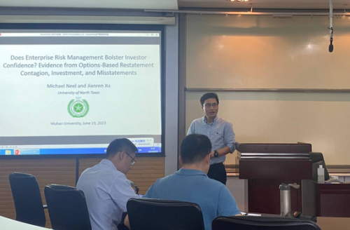 保险与精算系主办的珞珈保险论坛第二十七期在学院举行。论坛邀请到美国北德克萨斯大学瑞恩商学院徐健人老师做了题为“Does Enterprise Risk Management Bolster Investor Confidence? Evidence from Options-Based Restatement Contagion, Investment, and Misstatements”的学术报告。论坛由保险系王正文老师主持,学院多位师生参加论坛。