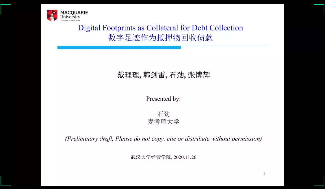 2020年11月26日下午,珞珈经管高端论坛第二十一期通过腾讯会议在线举行。此次论坛主讲人为澳大利亚麦考瑞大学商学院金融学石劲教授,论坛主题为“数字足迹作为抵押物回收债款”。本次论坛由av直播 副院长李青原教授主持,学院师生积极参加了此次论坛。