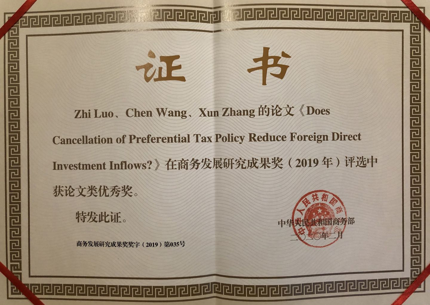 av直播罗知教授以第一作者身份发表在China & World Economy(vol.26, No.6, 2018)上的论文Does Cancellation of Preferential Tax Policy Reduce Foreign Direct Investment Inflows获得商务发展研究成果奖(2019)优秀奖。商务部1999年开始设立全国商务发展研究成果奖,每两年评选一次。该奖项面向全国的社会科学类奖项,用于奖励商务领域具有前瞻性、创见性,有较高理论和学术价值的著作、论文和研究报告,以及对政府决策和实际工作产生重要影响的研究成果。