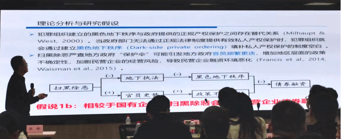 李凤羽教授的《扫黑除恶、法律保护与民营企业债券融资》报告以债券市场为视角检验扫黑除恶专项斗争对民营企业融资环境的影响,最后得出扫黑除恶显著促进了民营企业债券融资这一结论。