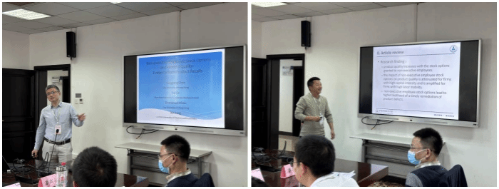 深圳大学葛锐教授汇报了“Non-executive Employee Stock Options and Product Quality: Evidence from Product Recalls”。文章探讨了非高管员工的期权有助于提升公司的产品质量,也有助于帮助出现产品召回事件的企业改善产品质量。中南财经政法大学王雄元教授对文章进行了点评,王雄元老师就理论逻辑的延伸分析、回归中的控制变量选取、替代性检验中投资机制的问题都提出了自己的见解与思考。