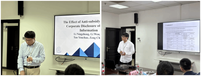 下午前半场由av直播 的周楷唐老师主持论文的报告与点评环节。暨南大学谭有超老师为大家带来了“The Effect of Anti-subsidy Actions on Corporate Disclosure of Subsidy Information”的论文汇报。谭有超老师指出,WTO禁止政府在出口过程中向企业发放禁止性补贴,并对禁止性补贴的定义进行了介绍。在理论逻辑方面,即使公司不清楚外部将如何利用披露的补贴信息,由于禁止性补贴在裁量过程中存在极大不确定性,企业仍会选择减少披露的补贴信息。苏州大学顾乾坤老师对论文进行了点评,建议可以区分反补贴和反倾销调查,以排除反倾销调查的影响。顾乾坤老师也提出了加入区分外资企业入股控制变量的意见,并就企业选择披露或不披露补贴信息的动机和与会老师进行了充分讨论。