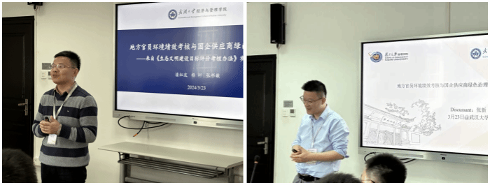 中南财经政法大学会计学院的王雄元教授主持第三和第四篇论文的讨论。潘红波老师就“地方官员环境绩效考核与国企供应商的绿色治理效应”一文进行了简要报告。论文以首次出台地方官员环境考核作为外生事件冲击进行双重差分检验,发现同省份民企客户的绿色创新水平显著提升。在理论逻辑方面,国企供应商通过扩大信用、降低采购价格和原材料风险的“激励措施”,以及减少合作的“惩罚措施”,均有效促进了民企客户的绿色创新水平。复旦大学管理学院的张新教授对文章进行了精彩点评,就文章的研究结果提出了省级官员注重民企环境表现,为相应民企诉求国有企业的让利的全新逻辑假设。