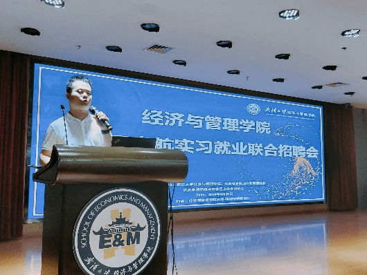 湖北省企业上市发展促进会副秘书长、武汉东湖新技术开发区上市公司协会秘书长涂堩中分析了就业的大环境,他鼓励学生积极展现自己,并祝愿同学们在本次招聘会上取得心意的工作。