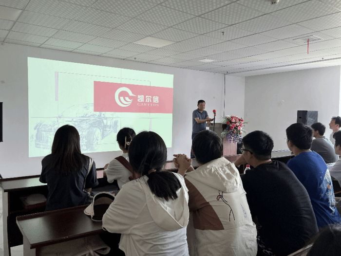 师生们在公司人事行政部宋家佩部长的引领下首先参观了公司展厅,初步了解了凯尔信公司的发展历程、业务与服务、av直播和优势产品。而后,宋部长带领大家参观了凯尔信公司的实验室、生产车间和装配车间,向大家详细介绍了凯尔信自动化、智能化的生产线,讲解了汽车零部件的生产原理和工序。