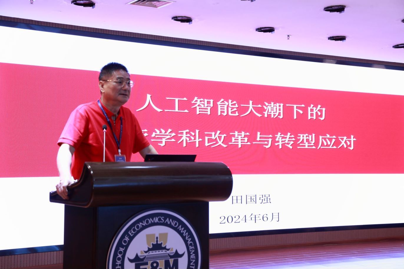 在主旨演讲环节中,美国德州 A&M 大学讲席教授田国强作了主题为“人工智能大潮下的经管学科改革与转型应对”的演讲。北京大学光华管理学院教授龚六堂则围绕“中国式现代化下经济学人才培养”进行了深刻阐述。