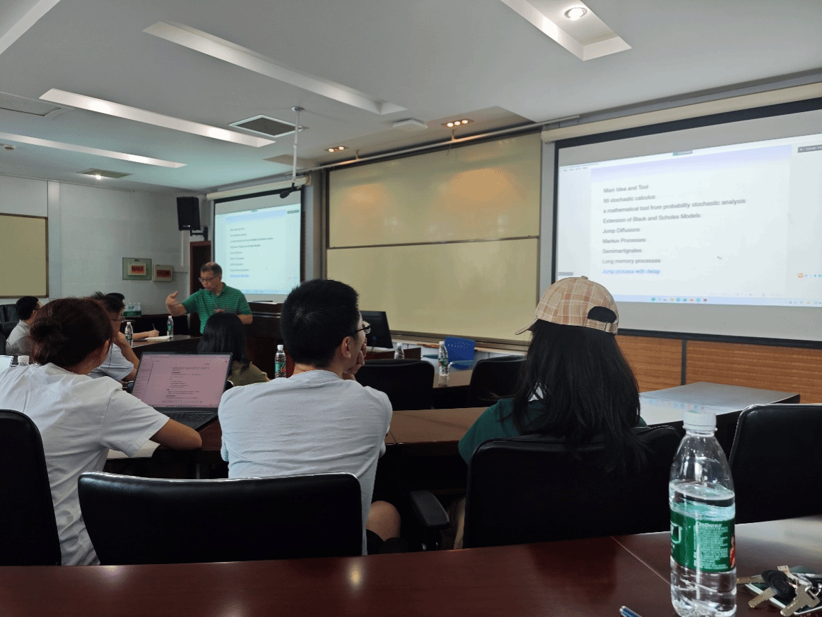 7月3日下午,加拿大阿尔伯塔(Alberta)大学世纪讲座教授、美国统计研究院会士胡耀忠教授受邀来院开展主题为Jump Models with Delay--Option Pricing and Logarithmic Euler-Maruyama Scheme(具有时滞的跳跃模型——期权定价与对数EM算法)的学术讲座,学院多位师生参加论坛。论坛由王先甲教授主持。