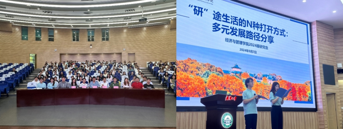 9月7日下午,学院2024年研究生新生“第一课”——“研”途生活的N种打开方式:多元发展路径分享讲座在经管院景林报告厅顺利举行。此次讲座以“生涯规划、科研启蒙、体制内外就业”为主题,邀请到四位优秀的朋辈学长学姐作为典型来分享他们在科研、求职等方面的经验。王意通学长分享了个人学术论文发表的感悟,汪瑜学长分享了个人在读博与就业之间抉择时的心得体会,徐圣翔学长向各位新生分享了自己备考公务员时的经验与心得体会,最后吕洁学姐则分享了秋招求职经验。活动现场氛围浓厚,互动频繁,取得非常好的效果。