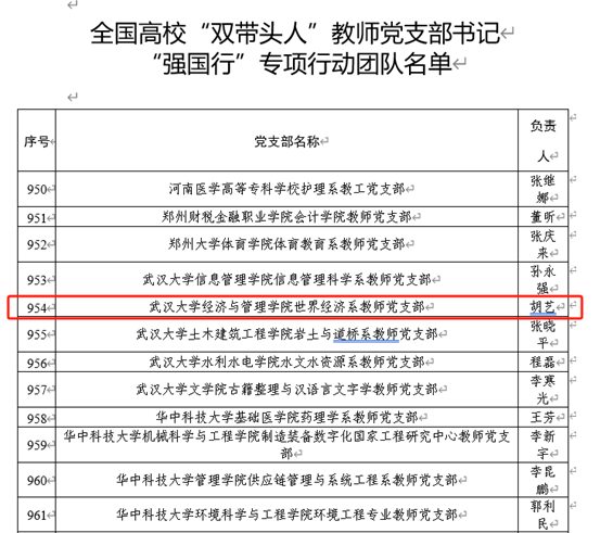 近日,教育部思想政治工作司公布了全国高校“双带头人”教师党支部书记“强国行”专项行动团队名单,av直播教师第二党支部(世界经济系)书记胡艺成功入选。