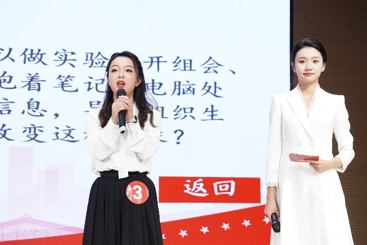 在实操风采展示环节,工商硕三党支书唐恬抽取的题目是研究生科研压力都很大,参与支部组织生活不积极,经常请假或到场干别的工作,影响政治学习效果,作为支书如何应对? 唐恬在1分钟的紧张作答时间内给出了四条对策:一是坚持正面引导,让广大党员意识到积极参与组织生活是每个党员应尽的责任与义务;二是围绕中心,支部应推动党建和业务深度融合,开展学术经验分享活动,缓解研究生学术焦虑;三是强化管理,以制度设计加强支部成员参与组织生活的考核和约束;四是拓展形式,以丰富的活动形式与活动内容提升支部组织生活的吸引力和感染力。唐恬的精彩作答为她赢得了整个研究生党支部风采大赛决赛的个人“最佳风采奖”。