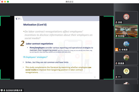 张教授从文献起源出发,进一步介绍了研究假设,谈判的场景及实证检验,为我们分享了一个有趣的研究问题。该项研究主要关注劳动合同重新谈判是否影响员工在社交媒体上披露雇主信息的动机及影响因素。作为有组织的劳动力,员工可以通过影响其公司在劳动力市场社交媒体上的声誉,提高其在劳动合同重新谈判中对公司的议价能力。
