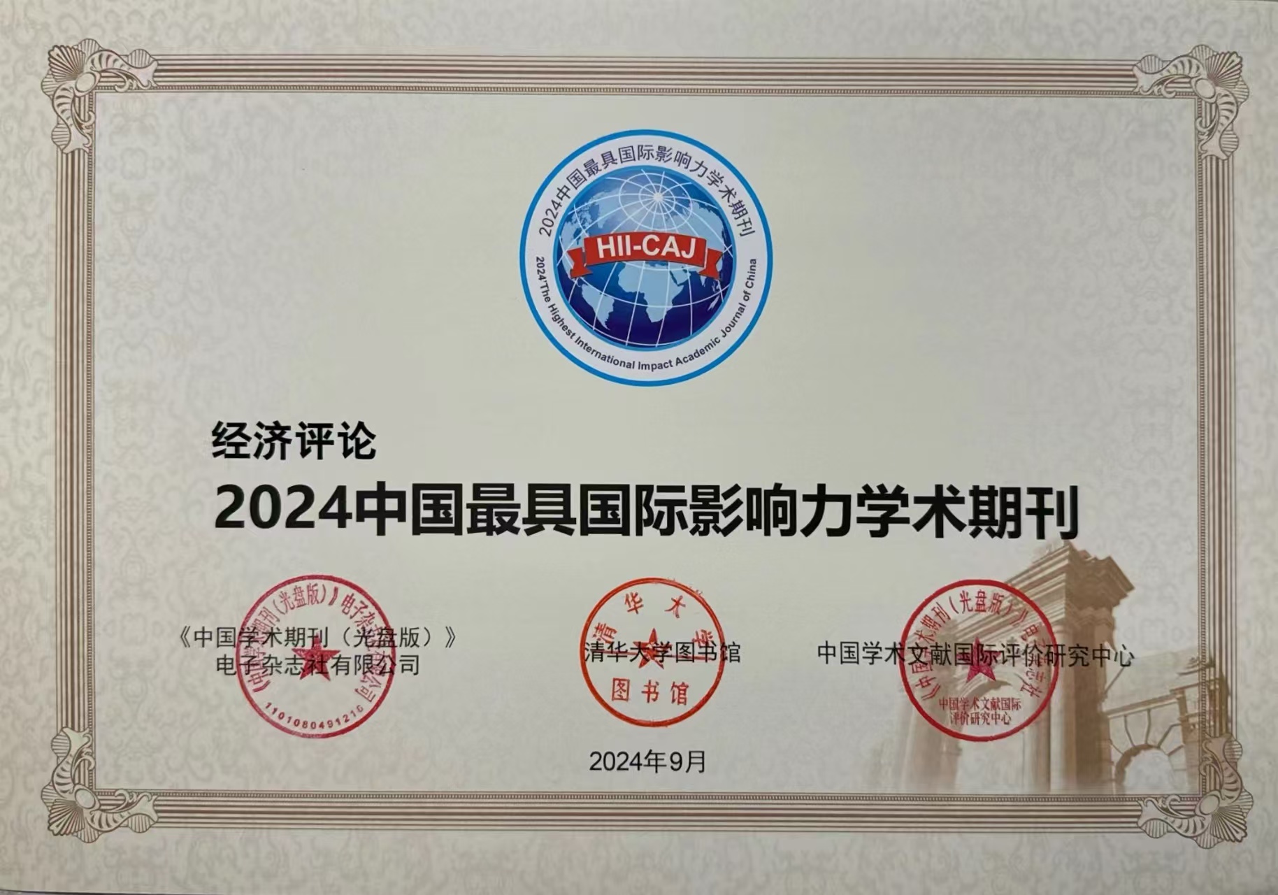 《经济评论》获评“2024中国最具国际影响力学术期刊”(人文社会科学•中文)