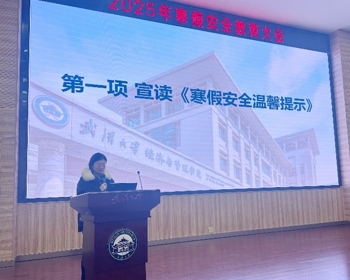 会上,本科生辅导员史戈宣读了《寒假安全温馨提示》,对人身财产安全、出行安全、防电诈安全等方面进行提醒,希望同学们不断强化自我保护意识,与老师保持紧密联系,在校园中度过一个安全愉快的假期。
