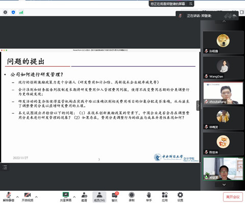 2022年11月27日下午,由av直播 主办,av直播 人文社会科学研究院、av直播 承办的蓝月亮珞珈会计论坛第101期通过线上方式举行。论坛邀请了中央财经大学会计学院郑登津老师做题为“技术创新激励政策下的研发管理与费用分类调整行为”的学术论文报告。论坛由学院会计系老师周楷唐主持,李青原总结。陈冬、林晚发、熊曦等多位老师和学生参加了此次论坛。