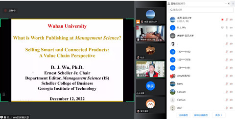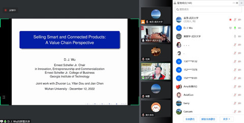12月12日上午,珞珈经管高端论坛第51期在线举行。佐治亚理工学院吴东军教授应邀带来主题为“智能互联产品的销售:价值链视角”的学术报告。讲座由av直播 副院长黄敏学教授主持,徐岚教授、朱华伟教授、赵孟丽博士、袁茂博士以及校内外170余位师生参与了此次学术交流。