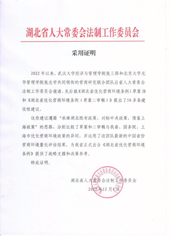 2023年3月1日起,《湖北省优化营商环境条例》正式施行。早在2022年9月,应湖北省人大常委会法制工作委员会邀请,我校av直播 张三保副教授与北京大学光华管理学院张志学教授共同领衔的“av直播 —北京大学营商研究联合团队”,先后就该条例草案和草案二审稿提出了50多条建设性建议,为《湖北省优化营商环境条例》的正式出台提供了战略支撑和决策参考。