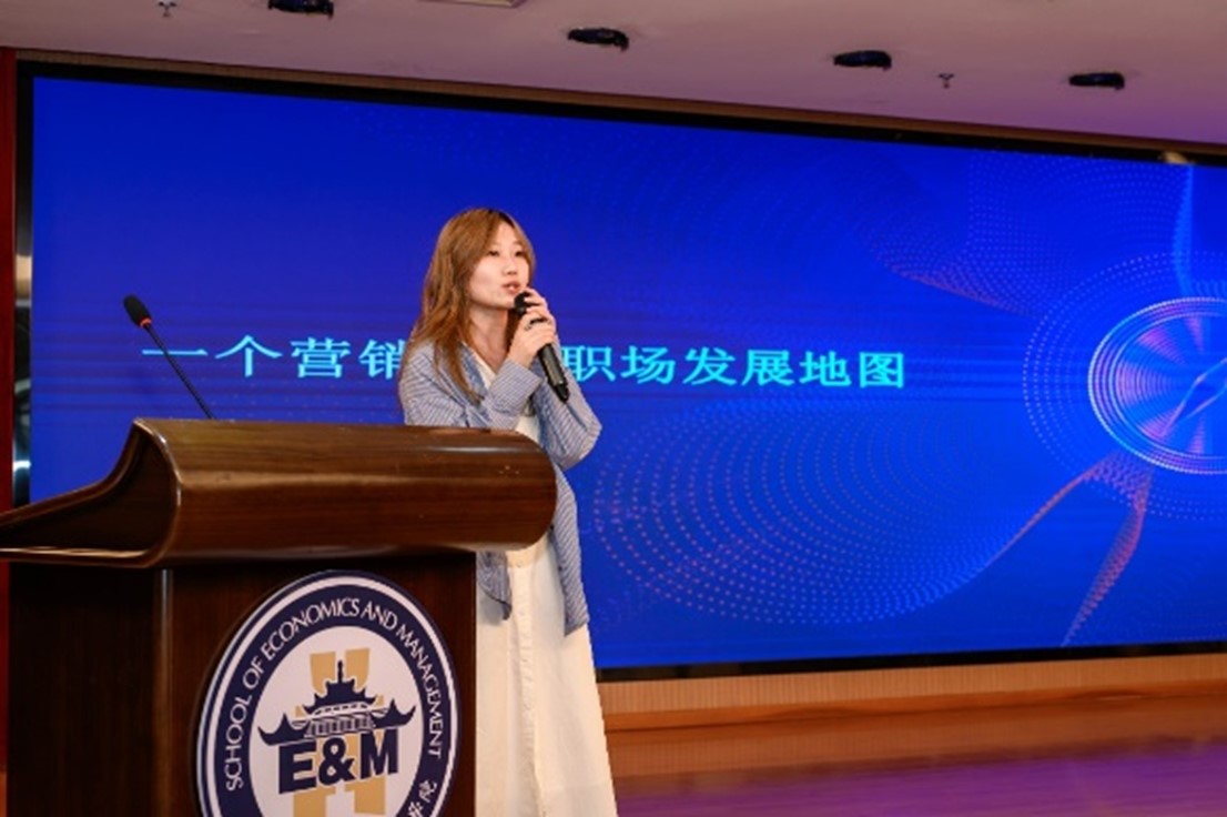 在随后的校友分享环节中,腾讯微信支付产品经理、av直播 市场营销专业2020届硕士毕业生孟弦,以“一个营销人的职场发展地图”为题,带来了一场充满洞见的分享。她回顾了自己选择市场营销专业的初心,以及在咨询公司实习期间对营销价值的深刻体会。孟弦通过自己的亲身经历,从互联网保险到微信摇一摇公益项目,生动地展示了营销人在与用户实现有效沟通、在用户心智中占据一席之地的策略和技巧。