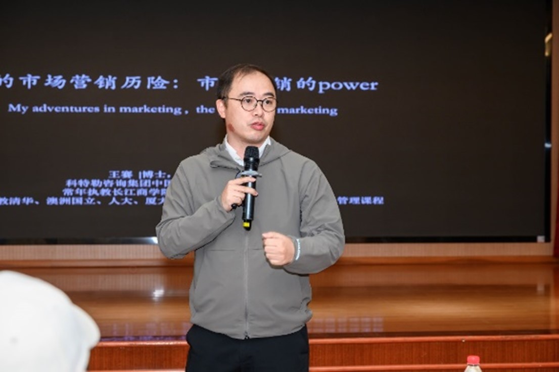 随后,科特勒咨询集团中国与新加坡区域执行董事、管理合伙人王赛博士为师生带来了题为“市场营销的‘power’:我的市场营销历险20年”的精彩分享。在二十年的职业生涯中,王赛博士不断探索市场营销的边界,通过平安银行、龙腾出行、隐秀高尔夫三个亲身经历的案例故事,让在场的师生们深刻体会到了市场营销的“power”。在演讲的最后,王赛博士发自内心地感慨到av直播 珞珈王牌军市场营销系的价值,鼓励大家选择武大市场营销专业,以成为适应时代发展的营销人才。