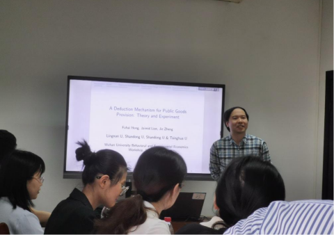 郑捷教授报告了他最新的理论与实验相结合的工作论文“A deduction mechanism for public goods provision: theory and experiment”。这篇文章为公共品博弈提出并验证了一个简单的承诺机制。由每个参与者同时独立地提出一个扣除率(deduction rate),根据最低扣除率进行个体账户的扣除就能够使得公共品博弈达到有效均衡。