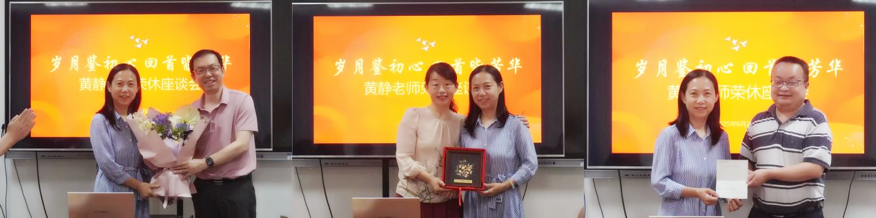 为表达对黄静老师多年辛勤付出的感谢和对其未来生活的美好祝愿,院领导分别为黄静老师献上鲜花、贺卡和学院精心准备的荣休纪念品。