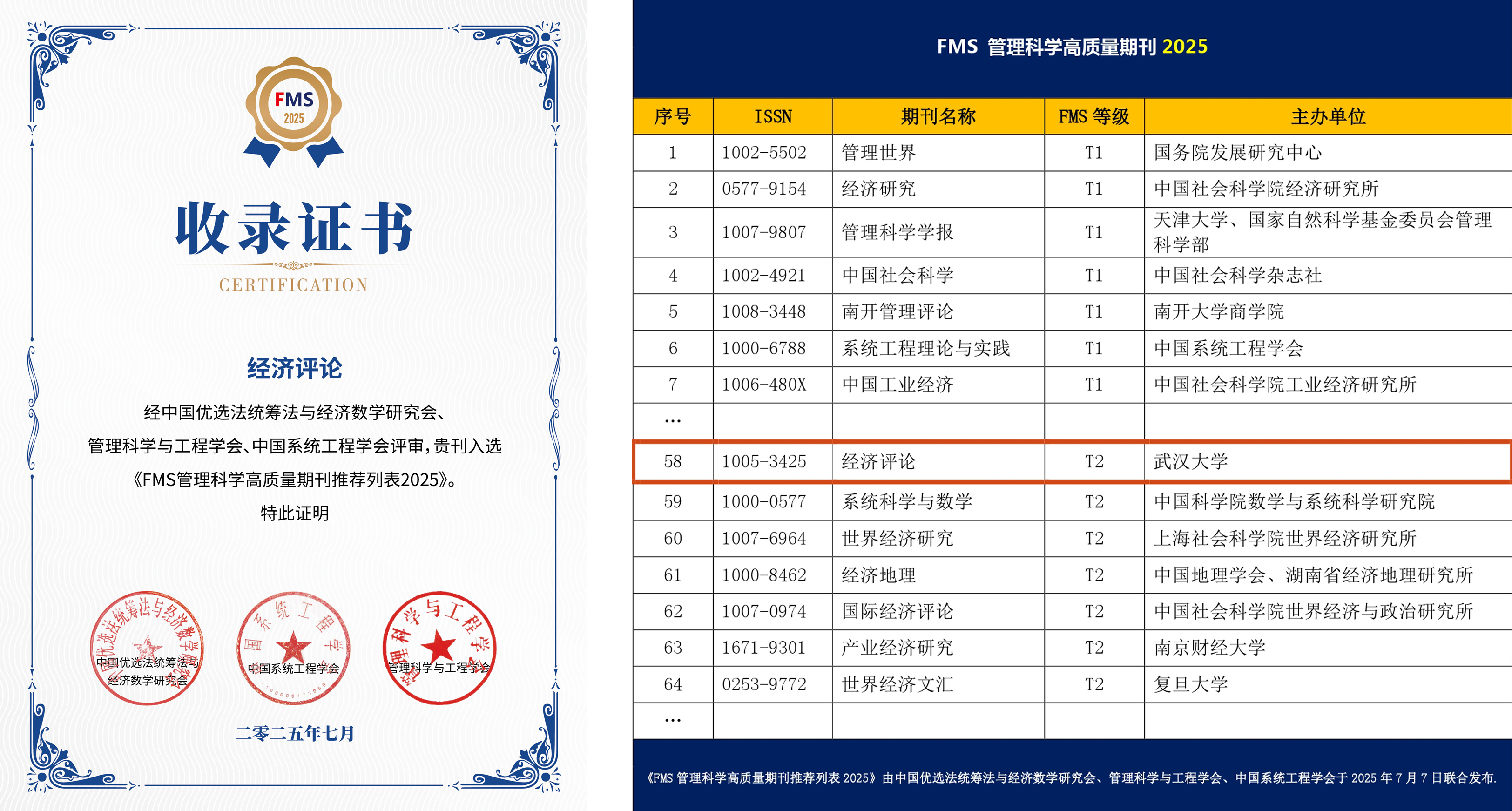 2025年7月7日,中国优选法统筹法与经济数学研究会、管理科学与工程学会和中国系统工程学会等三家国家一级学会联合研制并发布《FMS管理科学高质量期刊推荐列表2025》,《经济评论》继2020年、2022年成功入选之后,第三次进入FMS管理科学高质量期刊榜单。