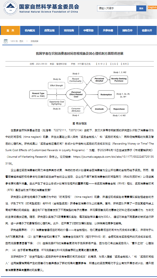 在国家自然科学基金面上项目“零售企业顾客奖励策略的促销效果研究:奖励金钱贡献还是时间贡献(72272111)”资助下,寿志钢教授团队的研究成果于2025年6月在UTD期刊Journal of Marketing Research在线发表。论文链接://www.nsfc.gov.cn/p1/3381/2825/94401.html。