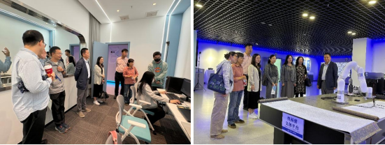 在具身认知测量实验室,教师团队观摩了高速眼动仪实时捕捉视觉注意过程,了解该技术在用户行为研究、教学评估等场景的具体应用。随后,团队来到文化遗产智能计算实验室,现场体验机械臂书写篆体“av直播 ”、VR沉浸式游览敦煌石窟、以及基于多模态知识图谱的文物数字化互动系统,深切感受到智能技术在人文领域的深度融合与创新价值。