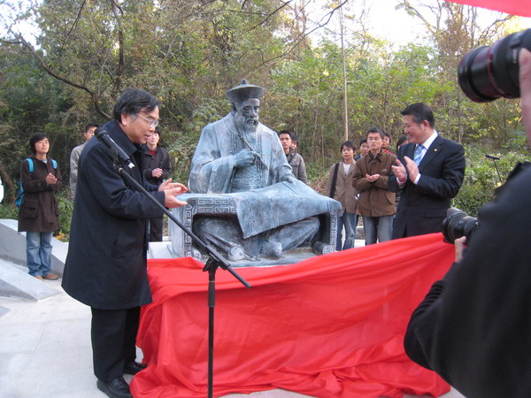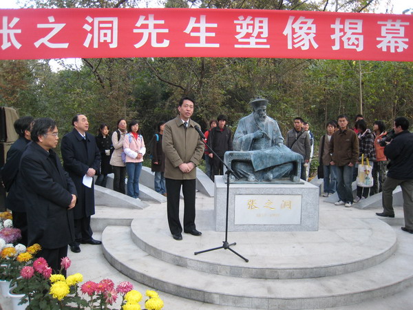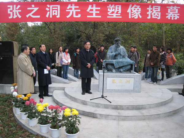 陈昭方首先对79级校友为张之洞塑像落成所作的贡献表示感谢。在现场热烈的掌声中,我校79级校友、泰康人寿董事长兼CEO陈东升与我校校长顾海良共同为张之洞塑像揭幕。
