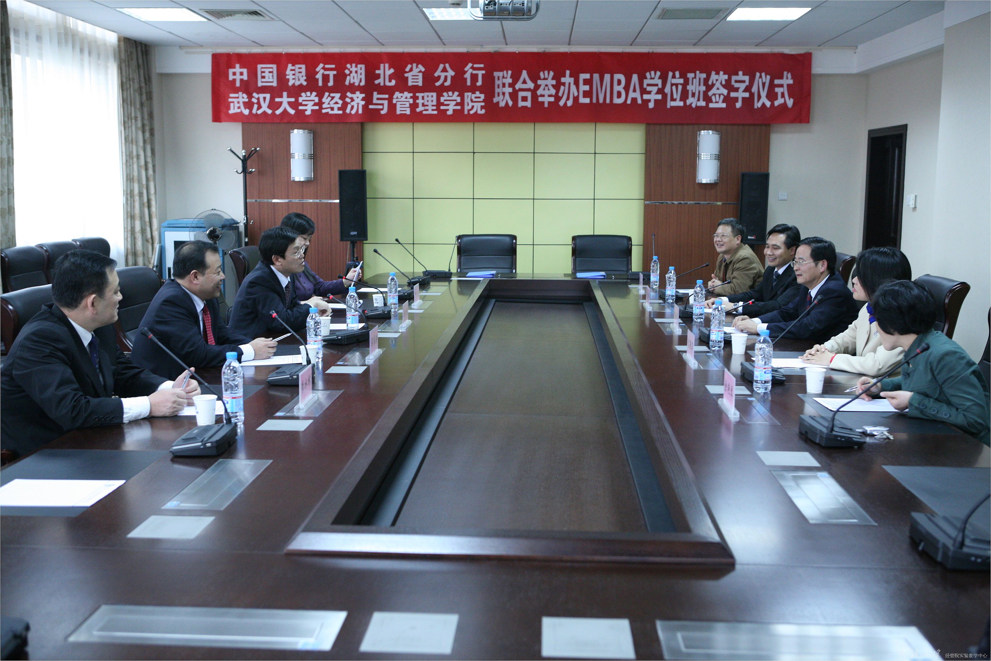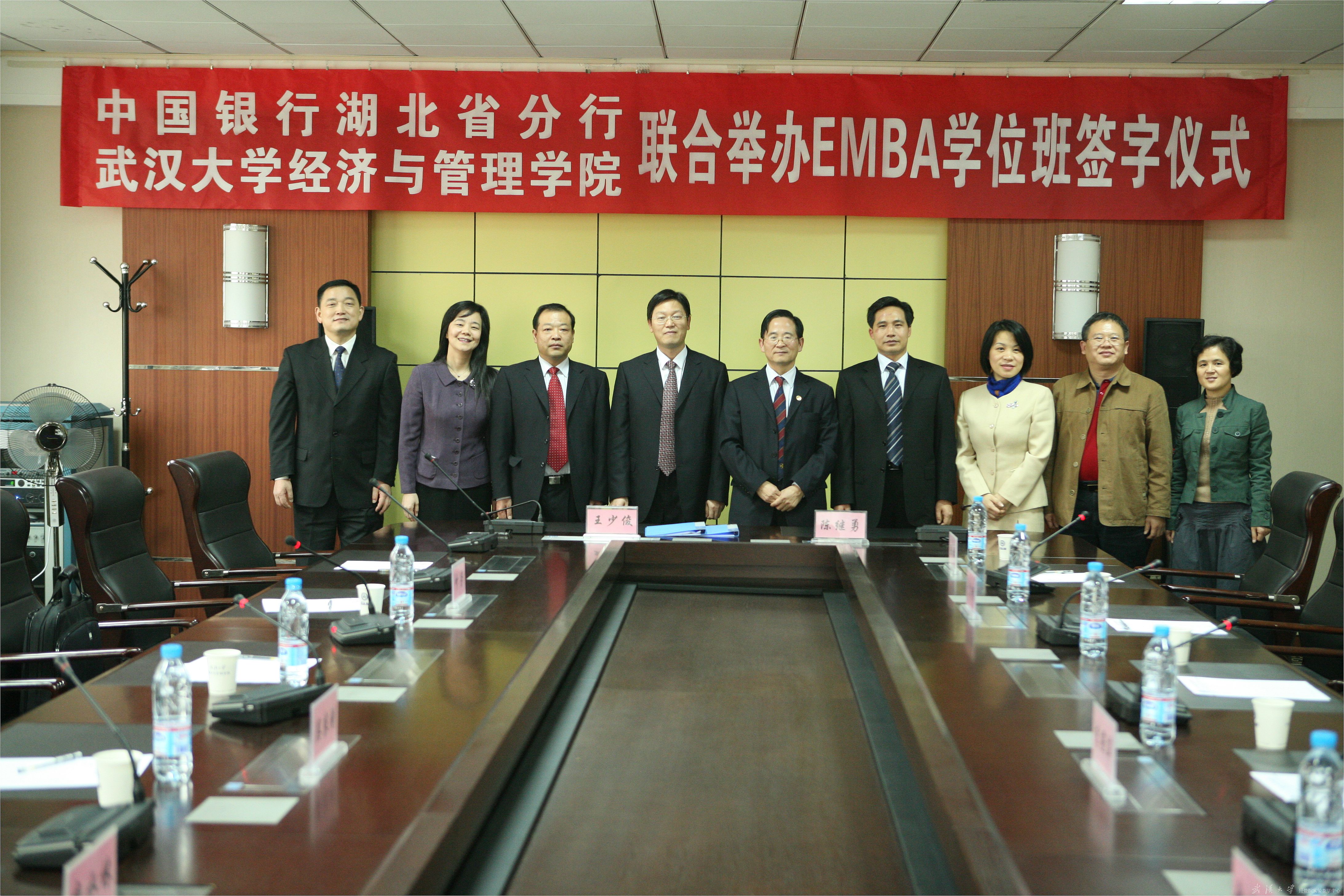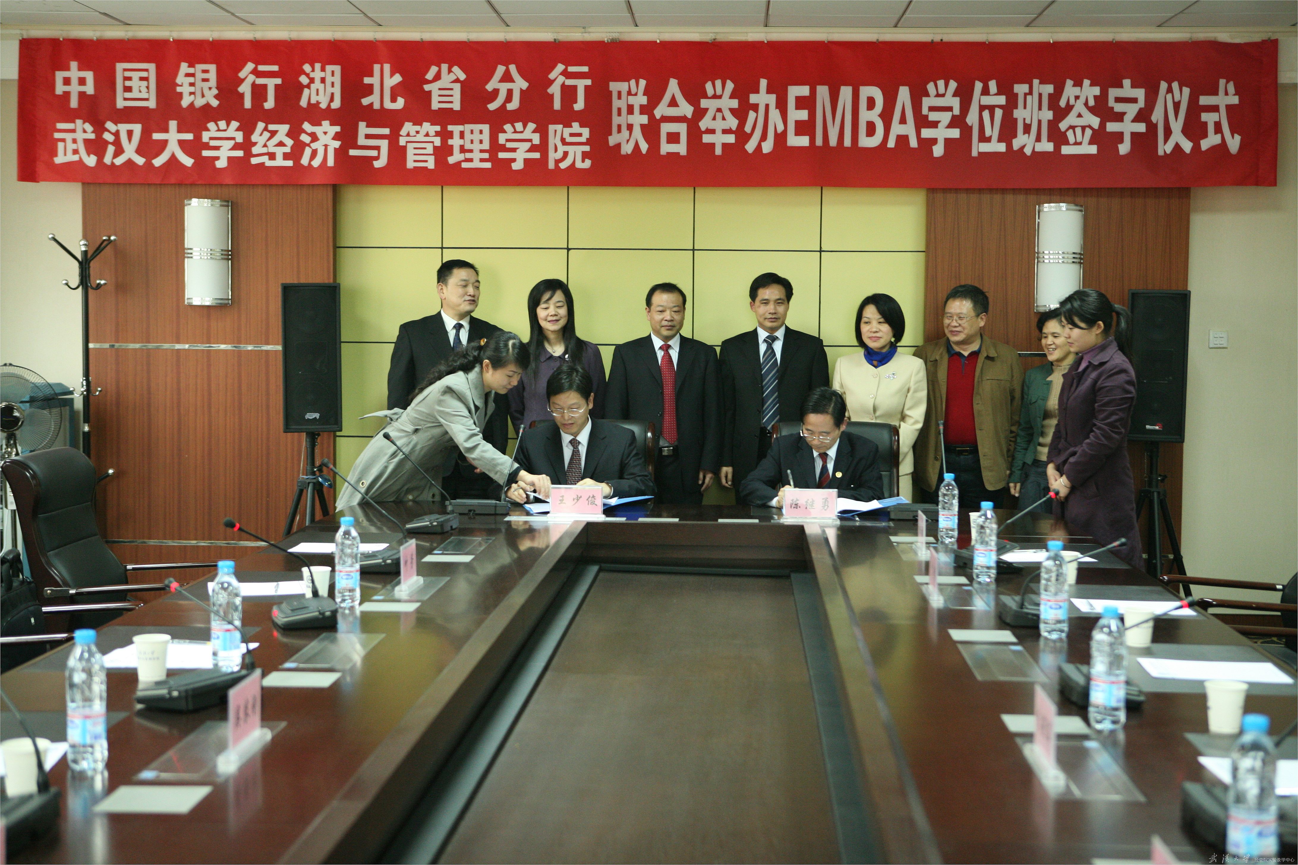 2007年11月8日下午,中国银行湖北省分行与av直播联合举办EMBA学位班合作协议签字仪式在学院第五会议室举行。中国银行湖北省分行行长王少俊、人力资源部总经理吴农刚、副总经理李水林、武汉东湖开发区支行行长叶芳,院长陈继勇、党委书记尤传明、常务副院长李燕萍、av直播 EMBA教育中心办公室主任余艳琴、项目发展部主任陈林出席了签字仪式。