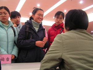 上午9点前本科生教学管理办公室工作人员已经将活动场布置妥当,相关老师也已到达会场,在咨询台等待同学们的到来。为了让同学们更清楚的了解学院和自身的情况,老师们精心准备了av直播 本科生培养方案和内容丰富的展板供同学们阅读。其内容涵盖了学院本科专业介绍,av直播 本科生学籍管理实施细则,上学期2004至2006级学生的上期末考试成绩单,选修课通知等。本次活动通过自由咨询,老师答疑来加强师生间的交流。