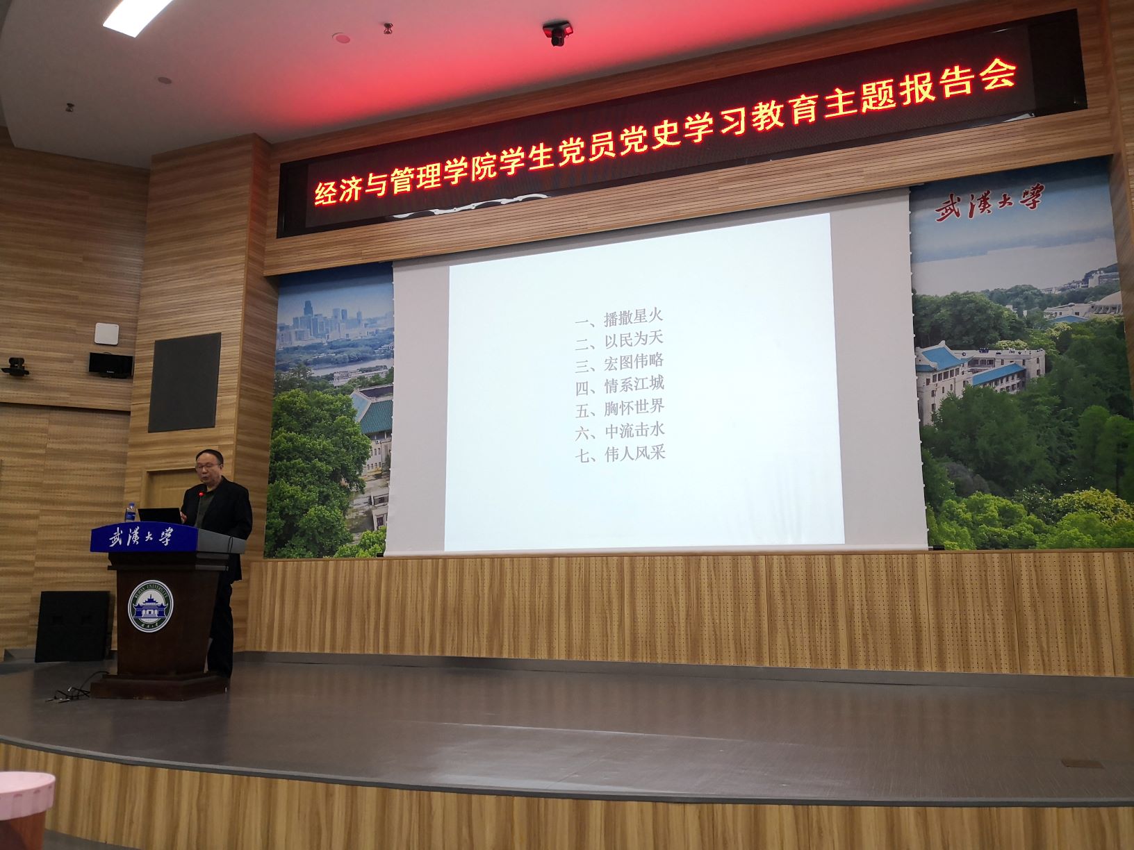 原党委书记、博士生导师李健教授为在场师生做了一场别开生面的专题报告会,报告会主题为《党的第一代领导人毛泽东与湖北武汉》。学院各研究生党支部的党员、预备党员和发展对象近500名同学参加了报告会。