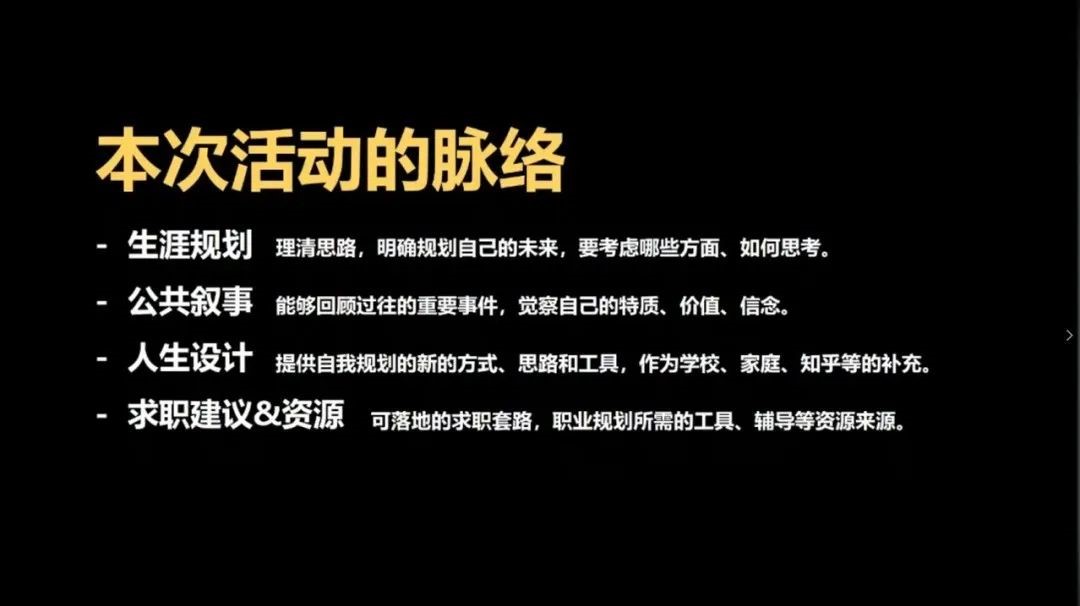 在这为期三日的学员培训中,主讲嘉宾谭睿其学长首先通过拆解生涯规划,通过悦纳自己、找到方向,评估当下、保持航向,回顾过往、理解自己、寻找道路,畅想未来、制定计划、快速试错四个步骤,详细拆解阐述了人生设计的概念。活动翌日,谭睿其学长通过“心流体验”、“美好时光日志”、“失败重构练习”等人生设计的工具、方法,引导参与学员进行自我定位。活动的最后一天,谭睿其学长从“无职业方向”这一问题引入,总结职业方向的确立应分为兴趣定位、能力分析、价值排序三个步骤,职业选择可以使用建立评估体系、运用多种知觉方式等方法,并向参与学员介绍了奥赛德计划及人生设计原型方法等职业规划所需的工具。本次活动内容丰富,层次渐进,充分引导大家关注自我,探寻适合自己的创业方向和兴趣。