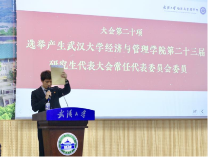 第二十次研究生代表大会代表候选人资格审查报告。大会总监票人马斌同学主持选举计票环节,五名研究生会主席团候选人分别上台竞选演讲并就研究生会工作的有关问题进行现场作答。