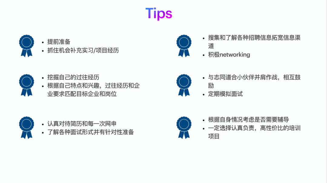 接下来,范师姐结合实例介绍了自己是如何准备应聘技能的。首先,在备战秋招时要对自己的实习、项目经历进行复盘梳理,从经历概述、最成功的部分、最大的困难、收获等方面做好准备,在其中体现自己的专业知识、软性能力(沟通能力、创新能力、领导力等)和对行业的深入认知。其次,在7-11月的秋招黄金季要把握好投递时间线,没offer时做到多投递、早投递;有offer后实现精准投递,冲击更好的岗位。最后,需要熟悉企业招聘的全流程,掌握各种类型的笔试、面试要点,对每家企业都实现精准化准备。