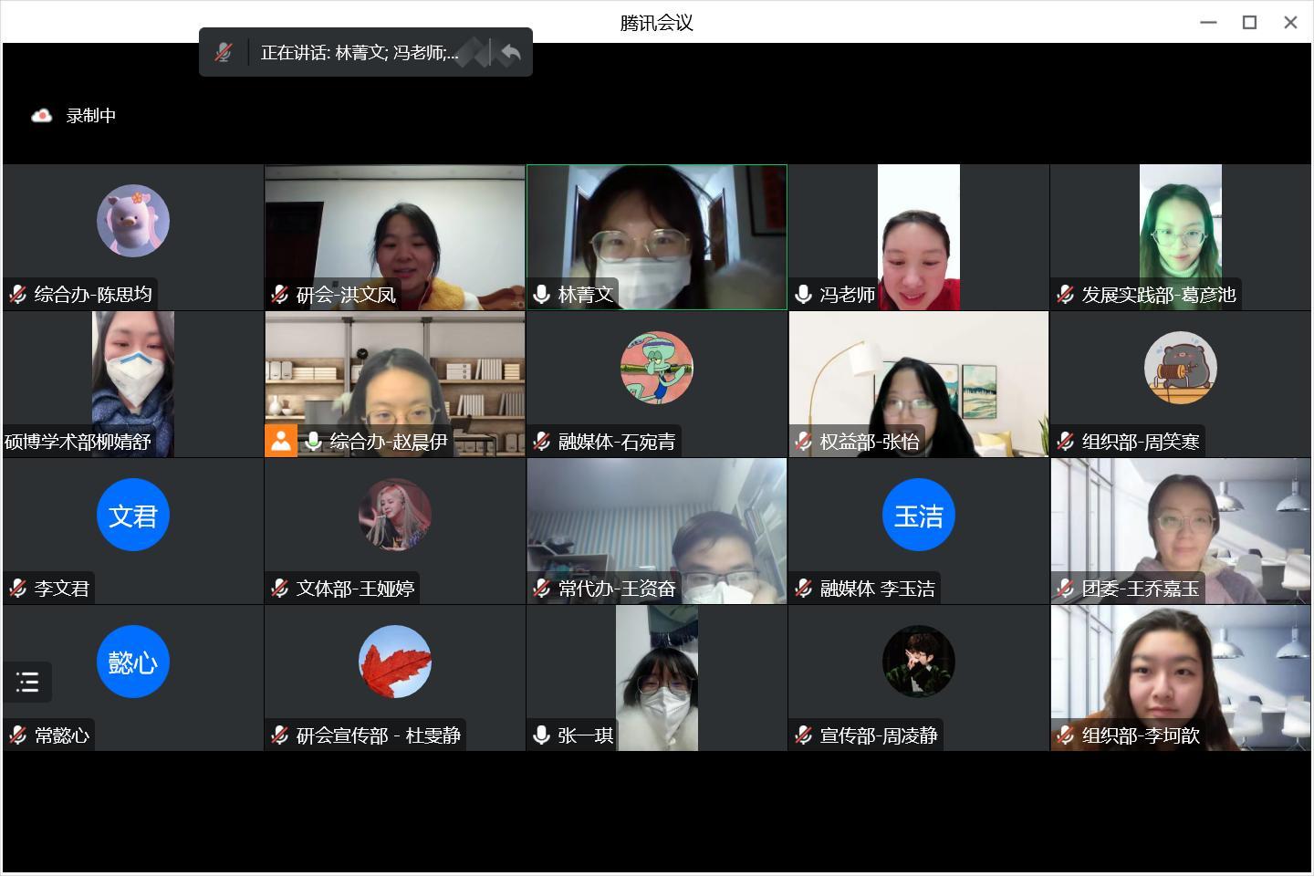 会议第四项,冯梦珂老师进行总结发言。冯老师表示,评比优秀研会对于每位同学自己的阶段性工作总结和研会集体的阶段性工作总结都是十分必要的,同学们要认真负责好自己的板块,有序开展工作。冯老师还强调了大家在面对困难时要锻炼起自己的韧性,要有克服困难的能力。同时,冯老师强调,身体是革命的本钱,同学们一定要增强体魄、提高免疫力。最后,冯老师带领大家学习了总书记2023年的新年致辞,希望寄予青年,同学们要厚植家国情怀、涵养进取品格,以奋斗姿态激扬青春,不负时代,不负华年。