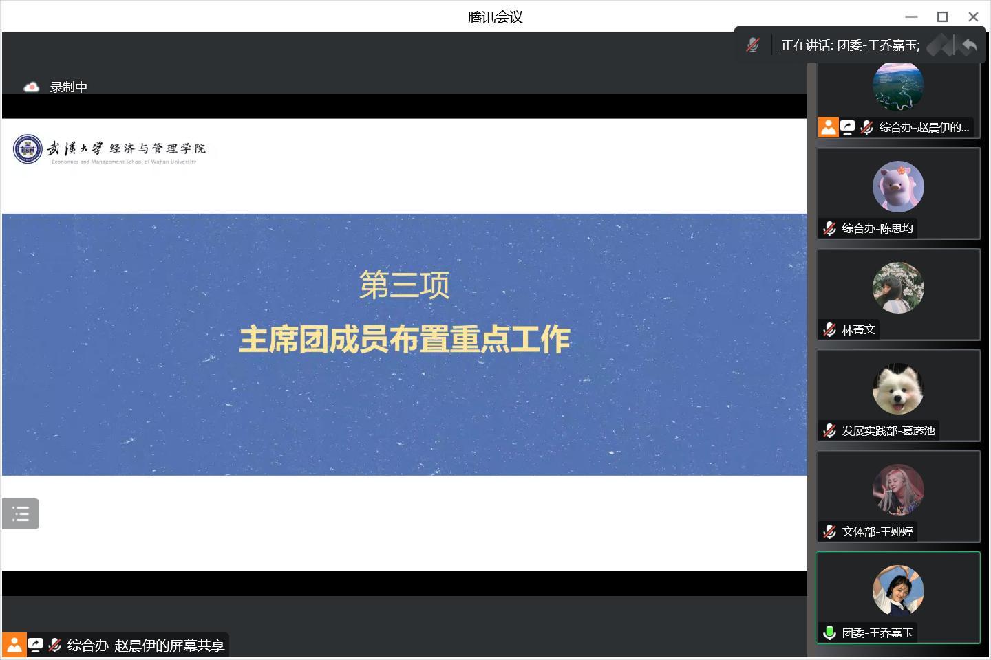 会议第三项,主席团成员就当前的重点工作进行布置和补充。学生团委副书记王乔嘉玉同学强调了团委组织部和团委融媒体中心的工作细节,主席团成员张一琪同学梳理了综合办公室和硕博学术部的下阶段工作安排,主席团成员洪文凤同学强调了2022年度经管团委研会工作大事记相关的信息收集整理工作,执行主席林菁文同学具体介绍了班委培训、班委述职评议方案和优秀研究生会评比相关的工作安排,王资奋同学带领大家学习了班长述职评议方案和班委述职评议方案,详细说明了方案的附件部分,并总结了工作要点。