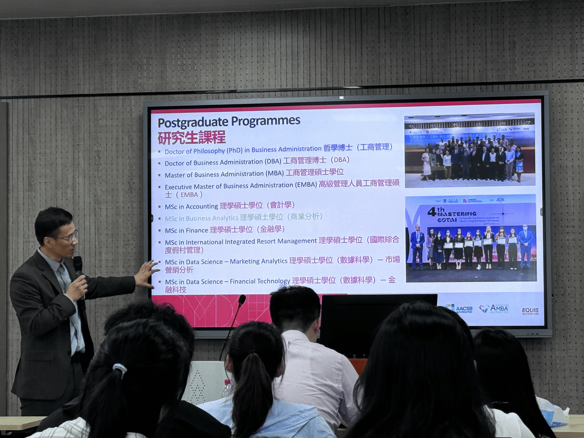 After the meeting, Professor Shu Lianjie gave a presentation on the master's and doctoral programs at the Faculty of Business Administration of the University of Macau to relevant undergraduate and master's students. The students were interested in discussing topics such as Macao's talent introduction policies, excellent university student summer camps, and specific requirements for program applications.