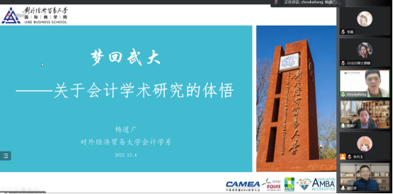2022年12月4日下午,由av直播 会计系主办的珞珈经管研究生学术沙龙|会计在腾讯会议平台通过线上方式举行。学术沙龙邀请了对外经贸大学国际商学院博士生导师杨道广教授展开了关于“梦回武大:关于会计学术研究的体悟”的主题报告。论坛由会计系潘红波教授主持,周楷唐等多位老师和学生参加了此次论坛。