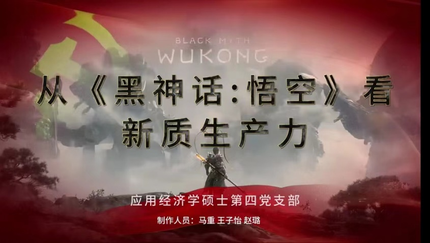 应用经济学硕士第四党支部也展示了他们的微课作品《从<黑神话:悟空>看新质生产力》。该微课讲述了《黑神话:悟空》以中国文化内容推动新质生产力发展的这一经典案例,讨论了其背后蕴含的理念和意义,并期待更多优秀的创作者在摆脱传统经济增长方式、生产力发展路径的同时,持续传播中国价值理念、体现中华文化精神、彰显时代精神气象。