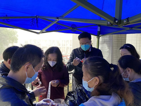 协调核酸检测也是突击队老师们的重要工作。根据学校要求,老师们协调学生按楼层依次下楼,保持安全距离,不交叉,排队采样,并提醒学生戴好口罩,做好防护;也有与医疗队一同,携带大量物资,挨户挨舍敲门提醒学生准备采样,做好人员核查和信息登记工作,确保宿舍成员全员采样。