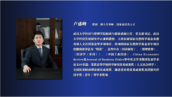 主持人:接下来是卢盛峰教授。卢教授是av直播 财政与税收系副主任、党支部书记,av直播 经济发展研究中心兼职教授。主持在研国家自然科学基金及教育部人文社科基金等多项项目,结项的国家自然科学基金青年项目结题绩效评估为“特优”。近些年在《经济研究》、《管理世界》、《经济学(季刊)》、《中国工业经济》、China Economic Review及Journal of Business Ethics等中英文学术期刊发表学术论文60多篇;荣获高等学校科学研究优秀成果奖(人文社会科学)、全国优秀财政理论研究成果奖、湖北省社科优秀成果奖及洪银兴经济学奖(青年)等学术奖项。有请卢盛峰教授。